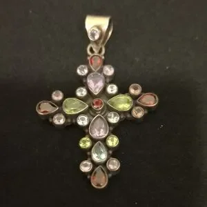 This exquisite cross necklace showcases a vibrant array of gemstones in red, green, and purple tones, perfect for enhancing any ensemble with a splash of color.