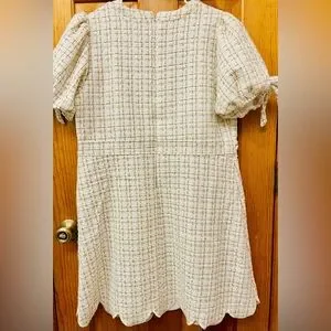 Extras: has gold chain between white crocheted trim that surrounds waist, bottom hem is scalloped, has 2 front pockets under waist trim, pearl buttons go down front center to waist, pockets have gold chain w/ pearl buttons on them, zip up back, sleeves puff out with bows on the end & have elastic style cuffs, & knee length