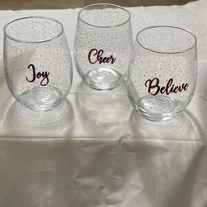 Holiday S/3 stemless wine glasses 3” opening and 5” tall: Joy, Believe, Cheer