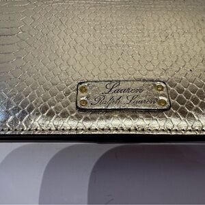 Chic metallic clutch with snakeskin texture. Features Ralph Lauren logo plaque. In great used condition. Very soft leather