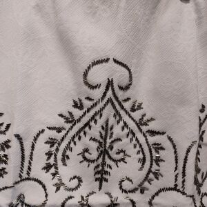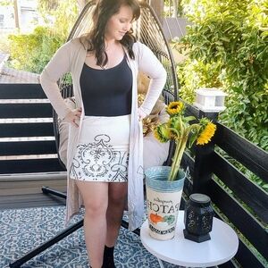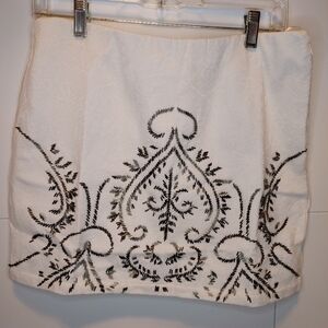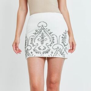 Beaded Mini Pencil Skirt in cream/white. NWT boutique item. Size Large. Shell: 100% Cotton. Lining: 100% Polyester. Approximate measurements: 30 inch waist, 38 inches hips, 16 inches length. Overall the skirt does not have stretch. The waist does because it has elastic. The inner lining is also stretchy. Side zipper and clasp. Absolutely gorgeous in person. Comes with extra beads. Very subtle floral embroidery on the skirt. Pair with a cardigan, boho hat, and boots for fall.