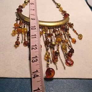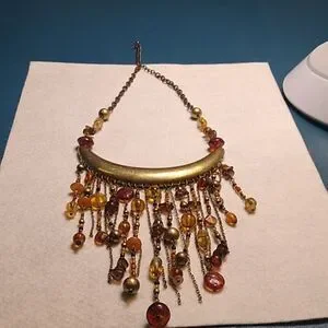 This stunning necklace features a cascade of gold and brown beads, perfect for adding a touch of elegance to any outfit.