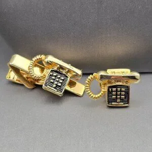 Embrace a touch of retro flair with this vintage gold-tone cufflink and tie clip set, featuring a charming rotary telephone design. Ideal for adding a unique, classic touch to formal attire.