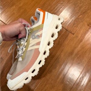 On Running shoes with sleek design. White base with orange and yellow highlights. Ideal for active lifestyle.