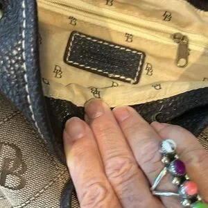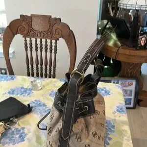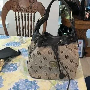 Stylish Dooney & Bourke shoulder bag. Features a classic brown and tan pattern. Perfect for everyday use.