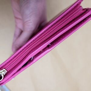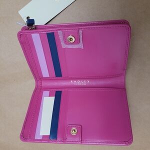 Stylish pink wallet by Radley London. Features a cute cat on clouds. Ideal for everyday use.