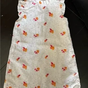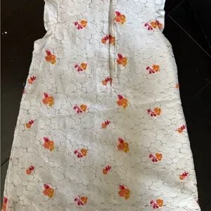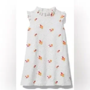 Elegant white dress with vibrant floral accents. Sleeveless design with ruffled collar. Ideal for casual outings.