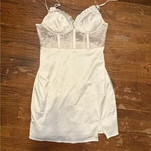 Elegant white dress with lace details. Spaghetti straps. Perfect for bachelorette wedding or bridal shower.