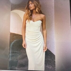 Chic strapless design. Soft cream color. Perfect for elegant events.