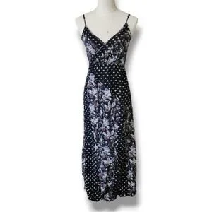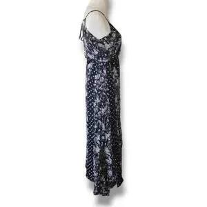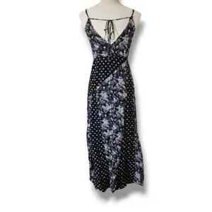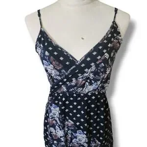 Maxi dress from Tobi. Adjustable spaghetti shoulder straps with tie in back. Crossover bust. Empire waist. Black/Cream/Blue. 100% Rayon. EUC. Size XS.
