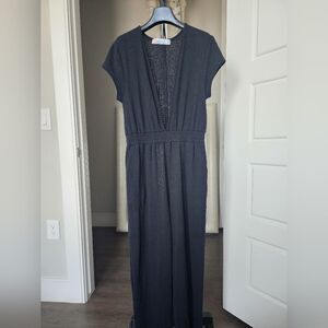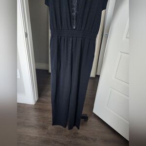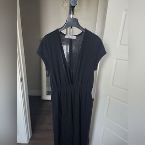 Stylish black jumpsuit with deep V-neck. Short sleeves and elastic waist. Perfect for any occasion.