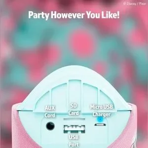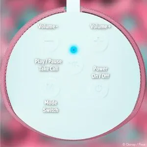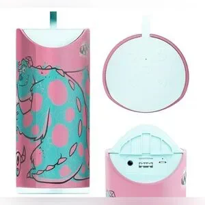 Pixar Bluetooth speaker featuring a playful design. Pink and blue colors. Splash-proof with up to 3 hours of playtime.
