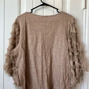 Elevate your style with this chic tan fringed top. Perfect for any occasion, this top offers a unique and fashionable look.