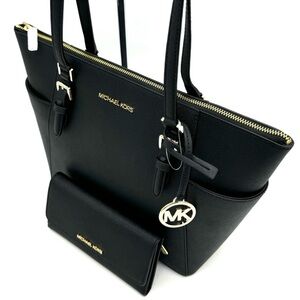 Michael Kors Large Charlotte TZ Tote Bag & Large Trifold Wallet Black/Gold
