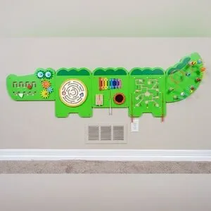 Made from durable wood and painted in bright, non-toxic colors, this adorable crocodile stretches across the wall to form five engaging activity zones, including: