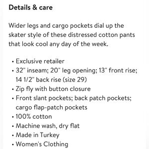 Casual wide leg pants with distressed details. Comfortable and stylish for everyday wear.