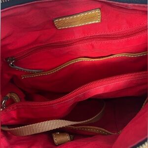 This Dooney & Bourke Erica hobo bag is a stylish and versatile addition to any wardrobe. With a rectangular shape and a zipper closure, this bag is perfect for travel, parties, or casual outings. The tan brown handle and brass hardware add a touch of sophistication, while the red lining and pockets provide a pop of color.