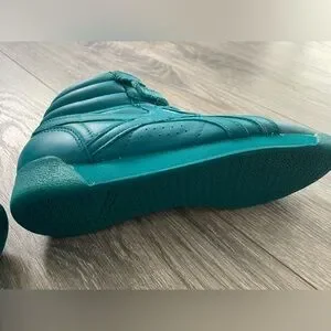 Vibrant turquoise high-tops by Reebok. These classics are in great vintage condition. The laces were damaged by the Velcro as pictured but the shoes have been cleaned and laces are easy to replace.