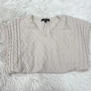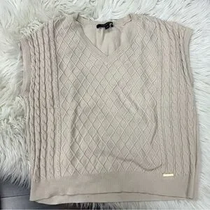 Chic beige V-neck sweater vest. Features elegant cable knit design. Ideal for layering.