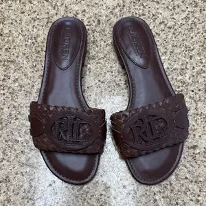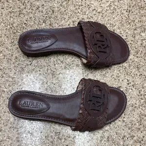 Lauren Ralph Lauren Alegra Woven Leather Brown Slide Sandals