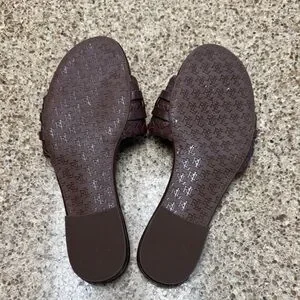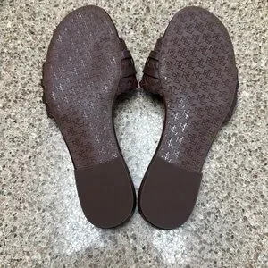Stylish brown slide sandals with woven detail. Features a distinctive logo design.