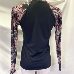Black shirt with pink & brown frond shoulders & sleeves, preowned in excellent condition, long sleeves, UPF 50+, stretch 86/14 poly/spandex, size XS.