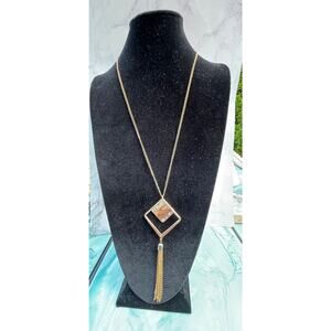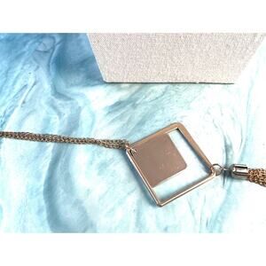 Make a statement with this stunning gold tone necklace! This piece features a unique geometric pendant with a square shape set inside a larger diamond-shaped frame. The inner square has a polished, reflective surface, adding a touch of modern chic. A stylish, flowing tassel made of multiple gold-toned chains hangs from the bottom, creating beautiful movement.