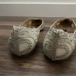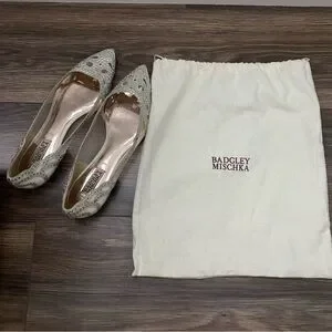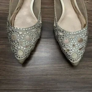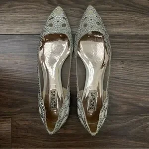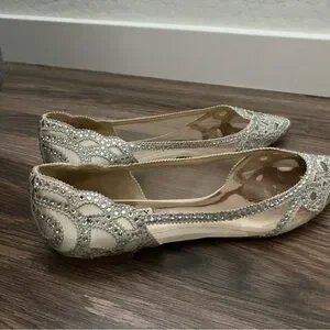 Accessorize a formal dress without having to endure the discomfort of high heels with Badgley Mischka Gigi flat evening shoes. These pointed toe flats are studded with hundreds of sparkling crystals that provide just the right amount of glamor. The upper edge of these slip-on shoes is delicately scalloped to highlight the crystal embellishments. Semi-sheer mesh inserts peek through cutouts in the sides and toes of these women’s formal shoes.