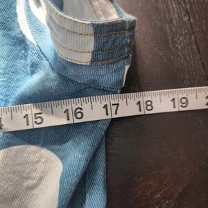 Playful blue jean mini dress with egg flower pattern. Features button-up front and short sleeves. Perfect for casual wear.