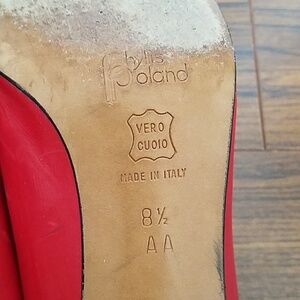 Phyllis Poland Size 8.5 Vero Cuoio Red Heels with black flower. Made in Italy. Comes with box.