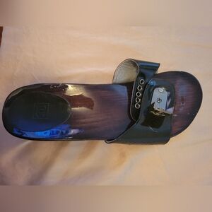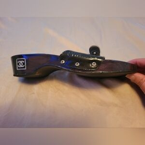 Step into iconic Chanel Y2K luxury with these authentic Chanel black patent leather wood clog slides. A timeless statement piece featuring a glossy black patent leather strap, adjustable silver-tone CC logo buckle, and an elegant curved wooden sole with Chanel branding.