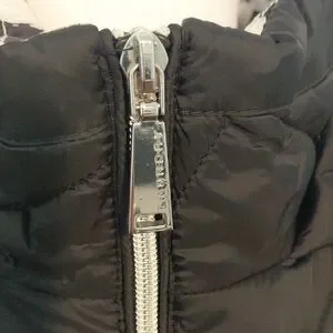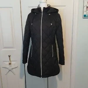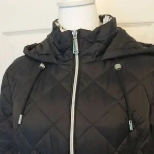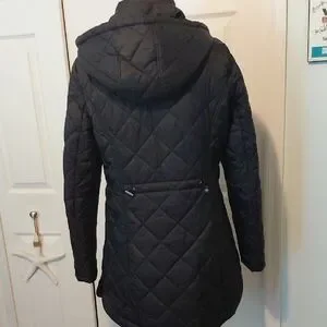 Worn once.Elegant black puffer coat with quilted design. Features a cozy hood and zippered pockets. Ideal for cold weather.