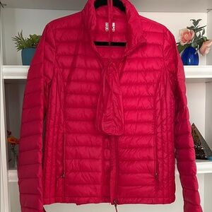 Bright red puffer for warmth and style. Lightweight and cozy. Ideal for cold weather.