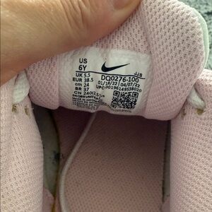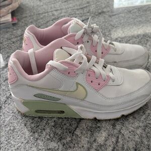 Chic Nike sneakers for kids. White with pink highlights. Light green accents on the sole.