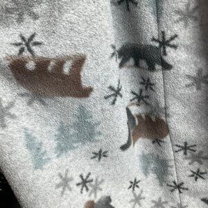 Soft fleece robe with a charming winter bear and snowflake pattern. Designed for warmth and comfort, featuring a belted closure and fold-over collar. Size Petite Medium, Very good condition , Side Pockets
