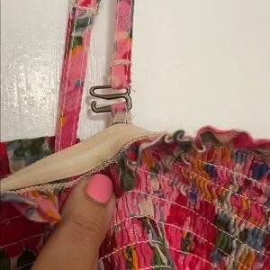 Bright floral dress with smocked bodice. Features adjustable straps. Ideal for sunny days.
