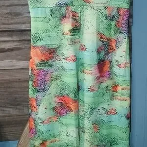 Eye-catching sleeveless jumpsuit with a tie-front detail. Features a vibrant mix of green, orange, and pink colors.