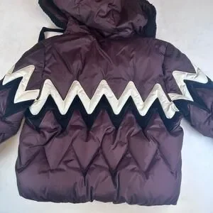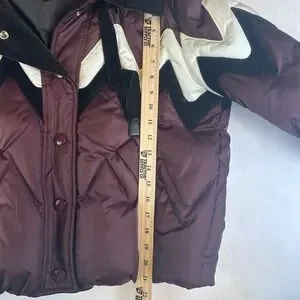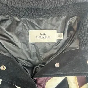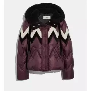 Keywords: Coach, Puffer Jacket, Winter Coat, Burgundy, Zigzag, Sherpa Hood, Cozy Jacket, Women's Fashion, Outerwear, Cold Weather, Quilted Jacket, Designer Jacket, Streetwear, Contemporary Fashion