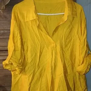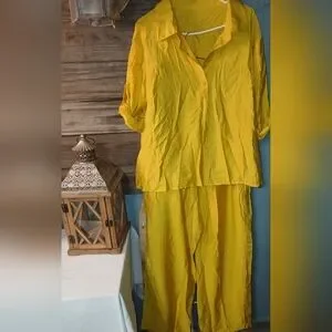 Vibrant yellow two-piece set with a button-up top and matching pants. Perfect for a bold, stylish look.