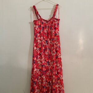 Elevate your style with this chic red floral midi dress. Perfect for any occasion, its vibrant design adds a touch of elegance to your wardrobe. Pit to pit 17-18” full button and hook closure 51” length including straps