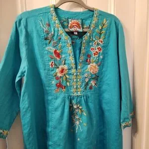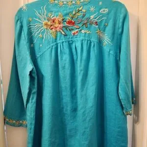 Johnny Was colorful turquoise linen top with embroidery details throughout. Longer length, generous size small.