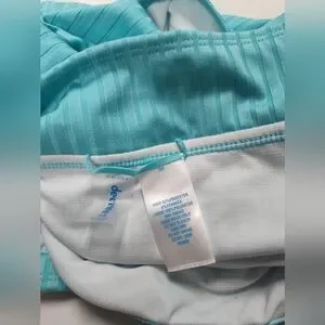 Chic turquoise ribbed tankini with bottoms. Features button accents. Ideal for casual outings. The top is a 1x and bottom is a 2x. bought as separates.