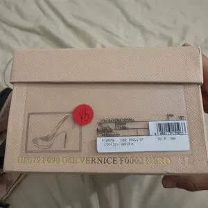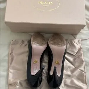 Chic and sophisticated Prada heels. Glossy black finish. Perfect for elevating any outfit.