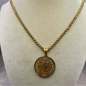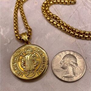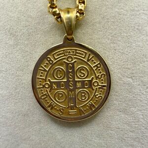 Gold Tone Saint Benedict Pendant Necklace. For Spiritual Protection. 24 inches
