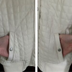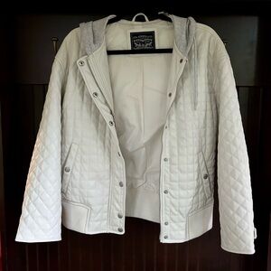 LEVI’S Faux Leather Quilted Hooded Bomber Jacket Ivory Zipper Snap Button | Sz S