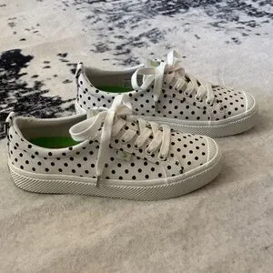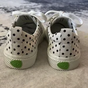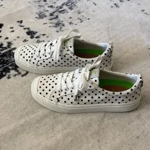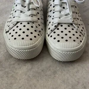 Chic white sneakers featuring black dots. Comfortable lace-up style. Ideal for everyday wear.