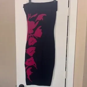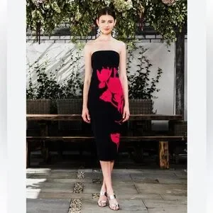 Elegant black strapless dress featuring a bold pink floral design. Perfect for special occasions.