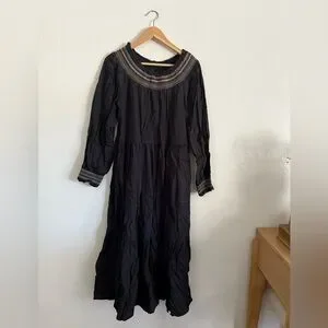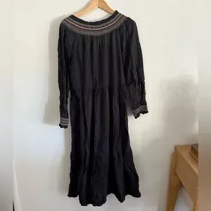 Like new Chic black dress with long sleeves. Features brown accents on neckline and cuffs. Perfect for versatile styling. Has pockets, stretchy waist and wrists.