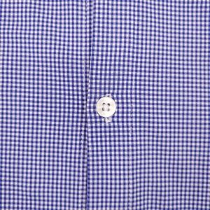 Features a blue and white gingham plaid pattern with white button front and cuffs.