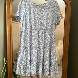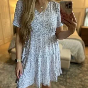 Stylish mini dress with floral design. V-neck and short sleeves. Perfect for everyday wear.
